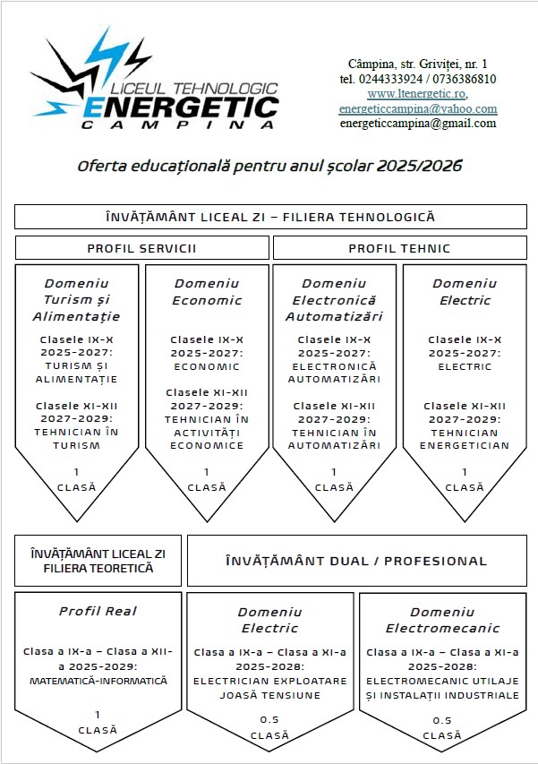 In anul 1972, la 1 septembrie, ia fiinta in cadrul Grupului Scolar Energetic si liceul, care a debutat cu doua clase. Daca, de-a lungul timpului, scoala a pregatit strict pentru domeniul energetic, dupa 1990 profilurile s-au diversificat, astfel ca azi elevii pot opta pentru: